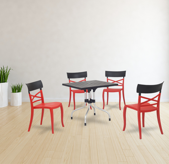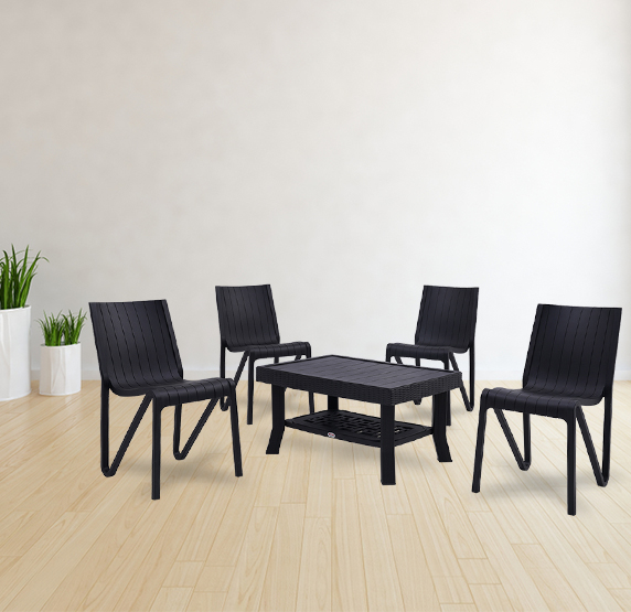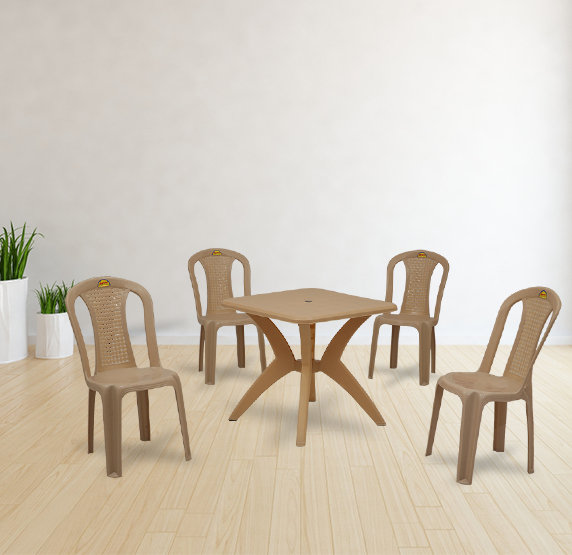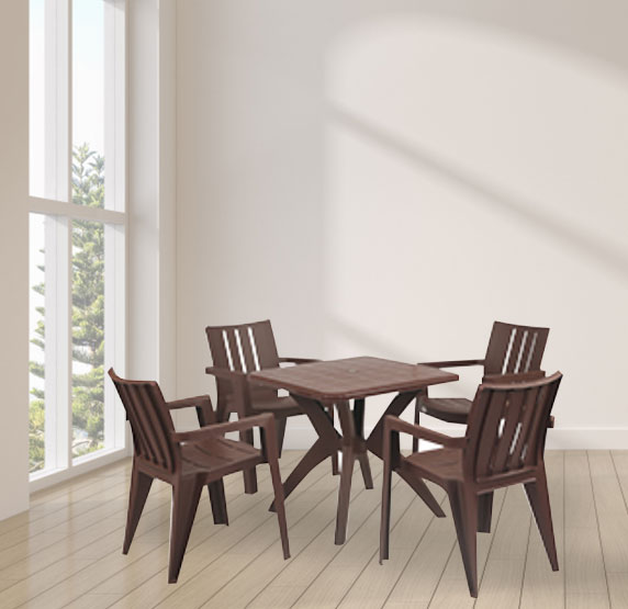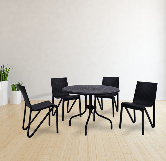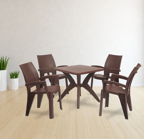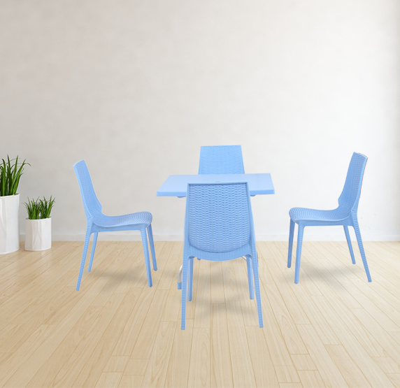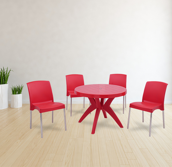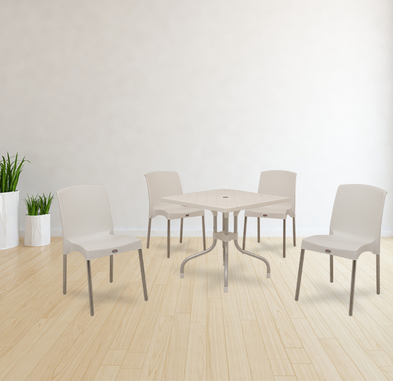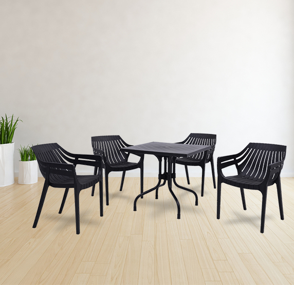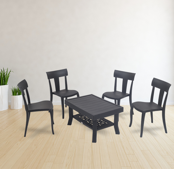 The 4 seater dining table and chair set from Supreme is perfect for smaller spaces or intimate dining settings. This plastic dining table with chairs offers flexibility for indoor and outdoor use, including kitchens, dining rooms, and garden terraces. The 4 seater dining set combines functionality with a sleek design, providing a practical and elegant solution for your dining needs.