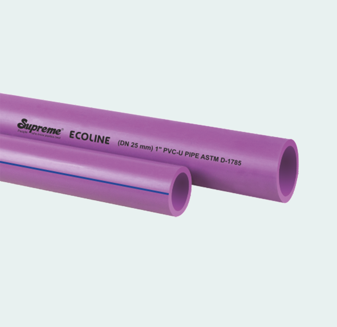 Supreme recently introduced the ECOLINE Pipes for reclaimed water or treated non-potable water. The soil and wastewater treated through STP’s can be further transported and distributed with the help of these pipes for different indoor as well as outdoor applications like flushing, gardening etc. These reclaim water pipes are made available in purple colour so that the reclaimed waterlines can be easily identified. Ecoline reclaimed water pipes are manufactured according to ASTM D1785 standards and are compatible with AquaGold uPVC fittings.
