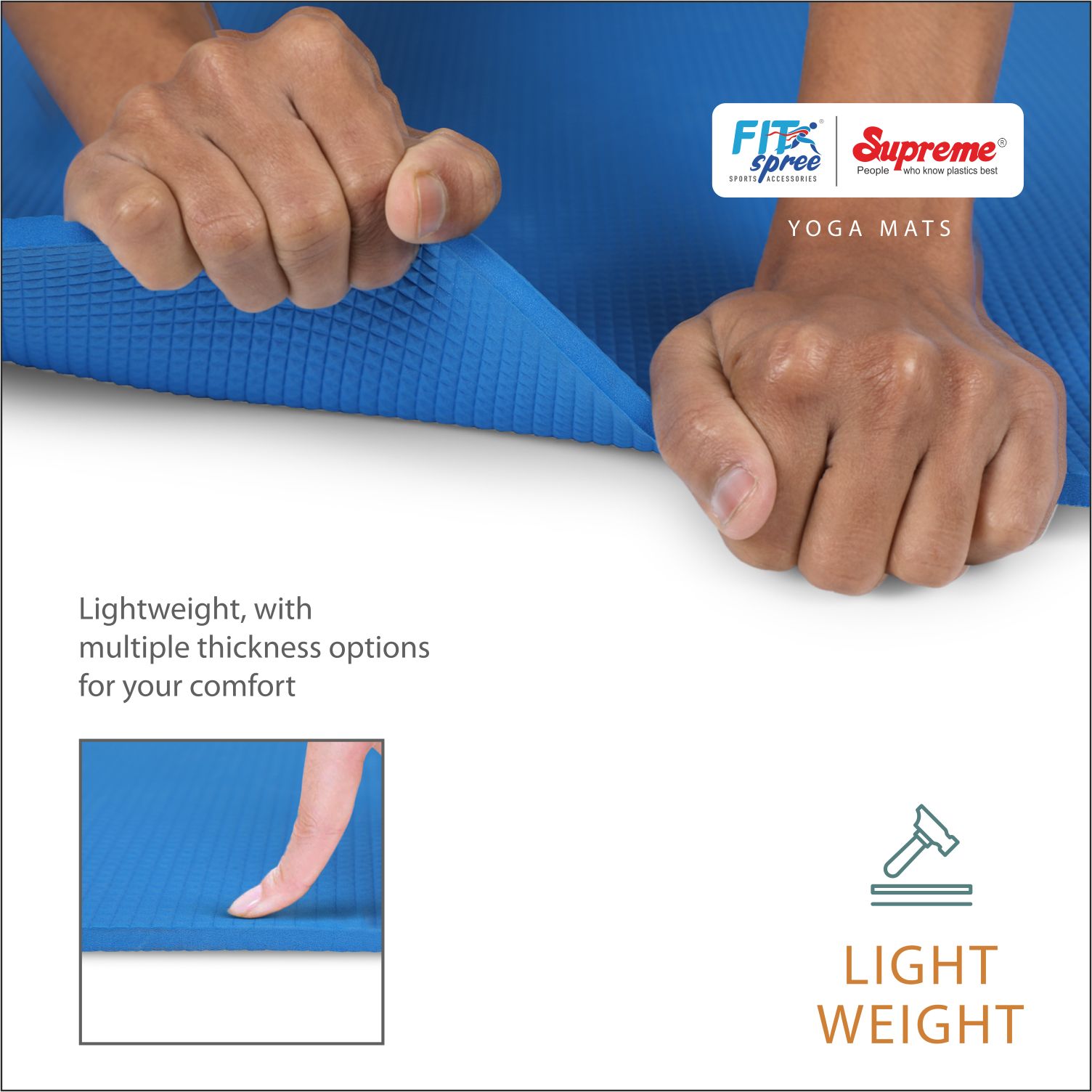 Fitspree offers yoga mats in different colors and thicknesses for various purposes such as 4mm - 6mm yoga mats: Typically used by beginners 7mm yoga mats - regular usage 8mm- 9mm yoga mats - hardcore exercise: Pilates 10mm yoga mats – Used for heavy/stout individuals